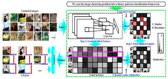 DAC is also applied to decompose the hidden patterns of the dummies with an advanced method [36]. It is one of the state-of-the-art algorithms for the image-clustering problem that uses a convolutional architecture and cosine distance to measure the similarity of pairwise images with adaptive parameters. It delivers superior performance in image clustering owing to its adaptive-learning algorithm. The network solves the image-clustering problem as a binary pairwise-classification problem. The flowchart is presented in Figure 5.