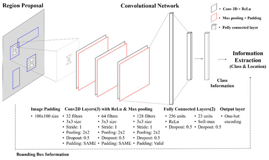 The detailed model structure is presented in Figure 6. We construct three convolution layers and two fully connected layers in the network. The number of convolution filters in each layer is 64, 128, and 256, respectively. A kernel size of (3 × 3), a stride of (1 × 1), and a max-pooling layer with (2 × 2) filters are used for local feature extraction. Fully connected layers consist of 256 and 23 units, and the ReLUactivation function is used throughout our model, except for the end unit, wherein a softmax function is used. For generalization of the model, the dropout method [38] is applied, which is set at 0.7. The purpose of the dropout is to prevent overfitting problems in the neural network-based model by applying a zero forward-direction propagation value stochastically to every layer.