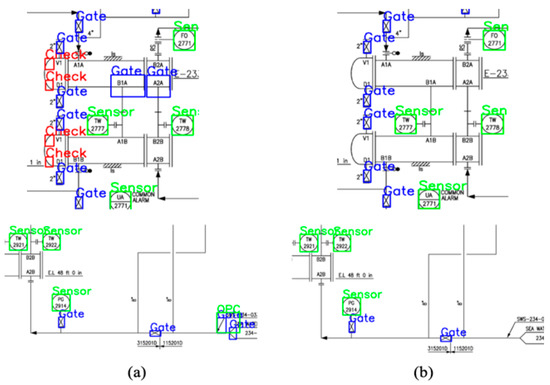 First, we only investigated the positive samples to test the performance of the model. The model recognized symbols in the test diagrams but could not distinguish dummy images from the proposed region. This demonstrates that the model, which is only trained with positive samples, can distinguish only symbols. We could observe that both PN models-k-means and DAC were superior to the P model in terms of target-symbol classification from the proposed regions. In Figure 8a, the symbols were well recognized by the P model, but dummies were also detected in the results. This means that the model, which was trained only on positive data, had a weakness in identifying negative samples as false. In contrast, PN models such as Figure 8b exhibited strong discriminative performance between symbols and dummies. The dummies confused with the check valves and gate valves were filtered out by the PN models. These results indicated that the assignment of a negative class for classification gives the model the ability to effectively identify symbols from the pool of binary component images.