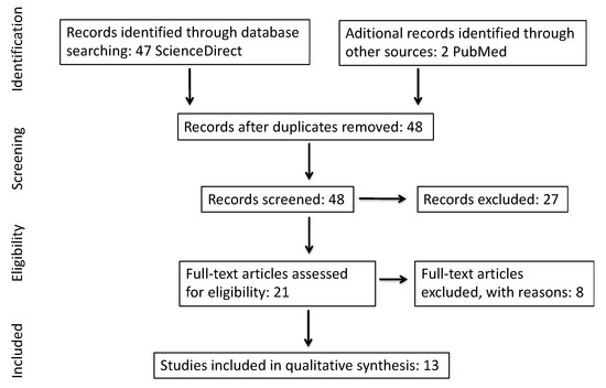 - Moher, D.; Liberati, A.; Tetzlaff, J.; Altman, D.G.; The PRISMA Group. Preferred reporting items for systematic reviews and meta-analyses: The PRISMA statement. PLoS Med. 2009, 6, e1000097. [Google Scholar] [CrossRef] [PubMed]