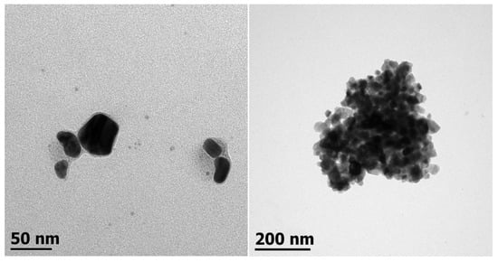 The applications of the PMMA–AgNP composites reviewed here are focused mainly on bone cements and acrylic bases for dentures. The most used synthesis method is mixing an aqueous suspension of silver nanoparticles directly on the monomer before mixing the monomer–polymer system. Other synthesis methods, such as cluster beam deposition and pulsed laser deposition, were used to form PMMA–AgNP composites [3,7]. Characterization methods show that the addition of silver nanoparticles modifies the mechanical properties of PMMA depending on the size and concentration used. The size of the silver nanoparticles reported in this review was between 2 and 200 nm, and a spherical shape was most commonly reported by authors. The size and shape depends on the synthesis method. The concentrations of AgNPs used on the materials tested were between 0.01% and 2% in aqueous solutions. An example of silver nanoparticles is shown in Figure 2.