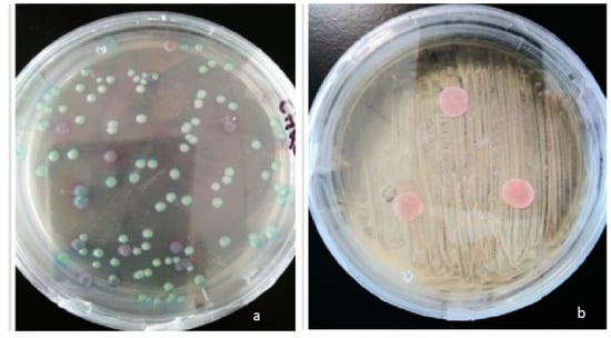 Example of a PMMA–AgNP composite application. (a) Culture obtained from a patient’s oral mucosa. The green colonies correspond to Candida albicans and the purple colonies correspond to Candida tropicalis cultured on CHROMagar Candida (CHROMagar, 4, Place du 18-Juin-1940, Paris, France, 75006). (b) PMMA–AgNP discs on cell culture plates. With this technique, we could not observe an inhibition zone because AgNPs could not be released from the PMMA discs. Silver nanoparticles embedded in the PMMA act as an agent that inhibits the growth of microorganisms on the surface of the discs. Author´s own images.