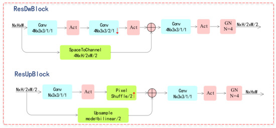 The encoder consists of four residual blocks with stride 2 for down-sampling. Batch normalization was found to have no beneficial effect and Ballé et al. [18] proved GDN was a good choice. However, group normalization (GN) [20] is simple and also a better choice from the experiments. It is more suitable for local divisive normalization and training large models which require small batches constrained by memory consumption. Moreover, the shortcut structure is introduced to feature fusion and extraction, which transmits more useful information to the following concatenate layer. The decoder also consists of four residual blocks with PixelShuffle layers for up-sampling. The activation function is leakyReLU. The details of the architecture are shown in Figure 4.