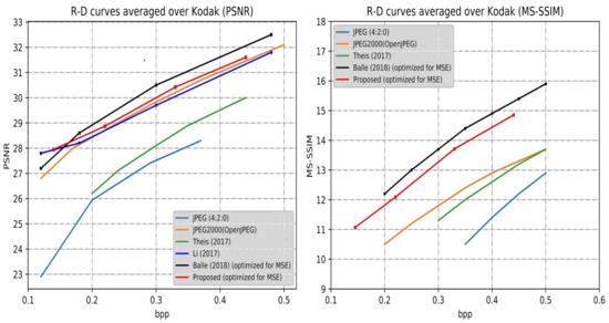 Rate–distortion curves of the proposed method and competitive approaches over the Kodak dataset. The measures are the PSNR and the MS-SSIM value as a function of BPP. Note that the PSNR’s formula is 10, and MS-SSIM values are converted into decibels for better visualization ().