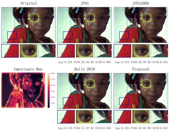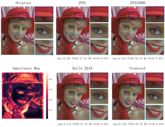 where and are the up-sampling channels, M is the down-sampling number, and is the mean BPP ratio in importance map. The image distortion was evaluated by PSNR and MS-SSIM. Some experiments were finished with the parameters = 5, 1 , 5, and = 32, 64, 128, , corresponding to BPP approximately in the range of (0.1,0.5).
