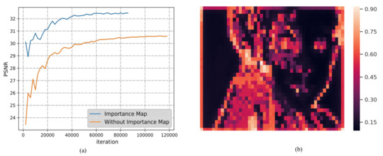 To assess the role of importance map, the training process of the baseline model without importance map was compared to the model with importance map at about 0.47 BPP. For the sake of fairness, the sizes of the two models were the same approximately. The details during training phase are shown in Figure 9a. The importance map is used for rate estimation, and improves the performance by about 2 dB. Moreover, the importance map of the specific image named kodim15 in Kodak dataset is shown in Figure 9b. The figure exhibits that the red region represents the value is large, where more bits are allocated, such as the regions with rich texture and edge.