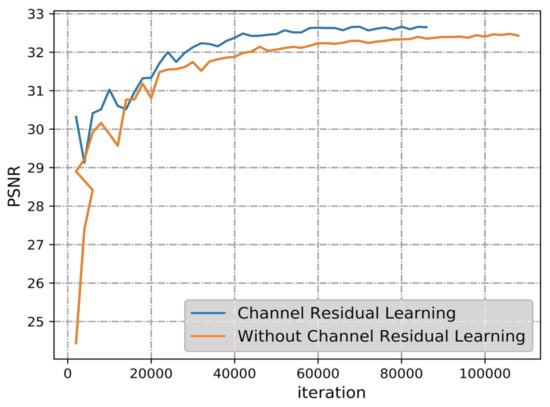 As with the above experiments, a baseline model without channel residual learning and another model with channel residual learning were implemented at about 0.47 BPP on CLIC test dataset. As shown in Figure 10, the PSNR is also improved about 0.4 dB. Therefore, channel direction residual learning may eliminate the noise, as described in Section 1.2.