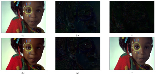 Process of global residual learning: (a) original x; (b) main information ; (c) residual ; (d) reconstructed residual ; (e) remained residual ; and (f) reconstruction . Note that for better visualization, salient region of the residual image was cropped.