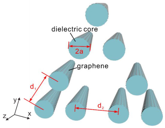 We start by studying the corner modes in the triangle structure, which is illustrated in Figure 1. The nanowire waveguide is placed in a triangle lattice and the SPP propagation direction is the z axis. Each unit cell carries three nanowires and the diameter of the nanowire is denoted as 2a. Each nanowire is coated by monolayer graphene, which can be realized by the CVD (chemical vapor deposition) growth. The structure has two different spatial spacings, which are denoted by d1 and d2, respectively. The relative permittivity of the background dielectric is represented by εb, which is assumed to be air with εb = 1 in this study. The nanowire is made up of SiO2 with the permittivity being εd = 3.9 in the infrared frequency. As a 2D material, the optical material property of graphene depends on surface conductivity σ. In contrast to bulk metal, the graphene surface conductivity can be adjusted as desired. The surface conductivity σ(T, ω, μ, τ) is figured out according to the Kubo formula [6], including inter- and intra-band transitions. The electronic band structures of graphene will be affected when graphene is rolled [52,53]. The geometric potential is introduced and the chemical potential of the curved graphene monolayer can be expressed by μc’ = μc − ħvF/a, where μc is the chemical potential of monolayer graphene sheet, vF ≈ c/300 is the Fermi velocity, and a is the curvature radius. The Kubo formula can be still used with a modified chemical potential. The chemical potential will decrease when the bending is considered. The main conclusions of our manuscript are still valid except that the effective refractive index of SPPs becomes larger.