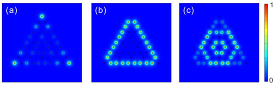 Although both the edge and corner modes are located in the bandgap, they can be well distinguished from their eigenmodes. Figure 3a–c illustrates the typical profiles of the eigenmodes (|E|) of the topological corner mode, topological edge modes, and bulk modes, respectively. The corresponding mode indexes are chosen as n = 18, 17, and 45. In Figure 3a, the field is mainly restricted to the three corners of the triangle and rapidly declines away from the corners. The waveguides at the three corners have the strongest field, the nearest adjacent two waveguides have a vanished field, and the next two waveguides have small fields. This alternating field distribution is also a typical characteristic of the topological mode and guarantees the mode is robust against some disorders. In Figure 3b, the energy is located at the three edges of the triangle and there is almost no energy present in the bulk waveguides nor the waveguides at the three corners. From the field distribution, one can see that the energy of the corner modes is mainly confined at the three waveguides at the corner and field, and the edge modes are extended into many waveguides that are located along the edge. Therefore, the corner modes have a smaller mode volume than the edge modes. In Figure 3c, we plot one case of a bulk mode. The fields almost expand into the entire structure.