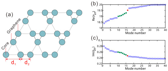 Topological bound modes depend on the bulk topology, which appears at the boundary of a structure with a nontrivial bulk topology. The structure shown in Figure 1 is similar to the extended Su–Schrieffer–Heeger (SSH) model in 2D arrays, whose topology is completely governed by the relative value of the coupling strength between the different nanowires [42]. The system topology of the bulk mode is trivial when the spacing d1 between the different waveguides in the same cell is smaller than the spacing d2 between the different cells. In contrast, the bulk topology is nontrivial as d1 > d2. Figure 2 plots the effective mode index of all eigenmodes for trivial and nontrivial structures. The total number of nanowire waveguides is N = 45, corresponding to five layers of a triangle lattice. The three corners of the triangle lattice are identical. In the above two figures in Figure 2, we plot the complex effective mode index for all supermodes as d1 < d2. The spatial spacing is d1 = 400 nm and d2 = 320 nm. The adjacent waveguides are evanescently coupled and the coupling strength is exponentially decreased with the increase in the spatial spacing. The relative coupling strength between adjacent waveguides in the same cell exceeds that between the different cells as d1 < d2. As a result, the bulk topology of the nanowires should be trivial and its edges and corners will not allow for topological modes. The results show that there is a bandgap in the spectra of the complex effective mode index. However, no modes are allowed in the bandgap. In the lower two figures in Figure 2, we reverse the relative values of d1 and d2 and the spatial spacing is d1 = 320 nm and d2 = 400 nm. The spatial spacing in the same cell now exceeds that in the different cells, that is, d1 > d2. The intra-layer coupling should be weaker than the inter-layer coupling. The bulk topological property of the nanowire now comes to be nontrivial and is able to sustain topological modes at its boundary. The complex spectra of the effective mode index still possess a bandgap. Moreover, there are three degenerate corner modes denoted as red dots, which are with almost the same effective mode index as neff = 19.5 + 0.25i. The effective wavelength of SPPs is inversely proportional to Re(neff). This indicates the oscillating wavelength of the corner states is approximately 1/20 of the incident wavelength. The subwavelength feature originates from the confinement of graphene plasmonics. Along with the corner modes, nanowires also support nine topological edge modes. Their eigenvalues, that is, the effective mode index, are also located at the bandgap, plotted by the green dots in Figure 2c,d. Results show that Re(neff) of the corner modes is larger than that of the edge modes, indicating the corner modes would experience a smaller modal wavelength than the edge modes. In addition, the imaginary effective mode index of the three corner modes is smaller that of the edge modes, reflecting that the corner modes experience smaller propagation loss and that the propagation distance of the corner modes is longer than that of the edge modes.