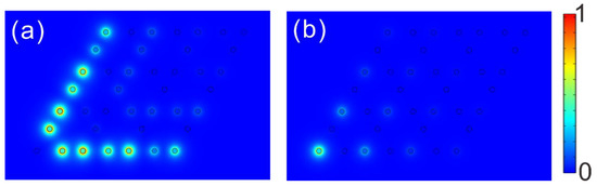 The discussed triangular lattice has only one type of corner and can support three degenerate corner modes. In contrast, the rhombic lattice has three different types of corners, the lower acute-angled corner, the up acute-angled corner, and two other obtuse-angled corners. The lower acute-angled corner is similar to that in the triangle lattice with a nontrivial topology, while the upper acute-angled corner is similar to that in the triangle lattice with a trivial topology. Therefore, one may expect the field will be confined at the lower acute-angled corner. Figure 5a,b exhibits the field distributions (|E|) of one topological edge mode and the topological corner mode, respectively. The corresponding mode indexes are n = 15 and 16. In Figure 5a, the fields of the edge mode are located at the left and lower edges of the triangle. In Figure 5b, the energy is mainly confined at the lower acute-angled corner and exponentially decreases away from the corners. There is no energy confined at the two obtuse-angled corners nor the upper trivial acute-angled corner. From the field distribution, one can also see the field of the edge mode is confined in several waveguides while the field of the corner modes mostly is concentrated in the single waveguide at the corner. Therefore, the corner mode has a smaller mode volume than the edge modes.