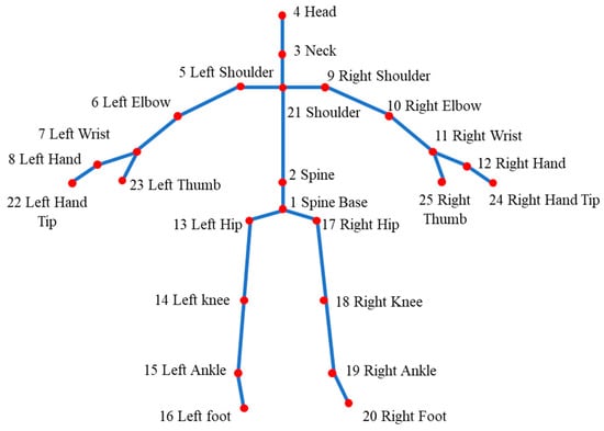Any movement consists of a series of postures. Eighteen joints were used to describe a posture in a series of volunteer subjects. It was decided to exclude joints such as those numbered 16, 20, 21, 22, 23, 24 and 25 (Figure 1) from algorithms, as they demonstrated high inconsistency in tracking accuracy. A total of 40 parameters were therefore calculated, based on 18 points: 17 were vector lengths (Table 1) and 23 were angles. However, each algorithm used a different number of parameters, as described in Section 2.3.