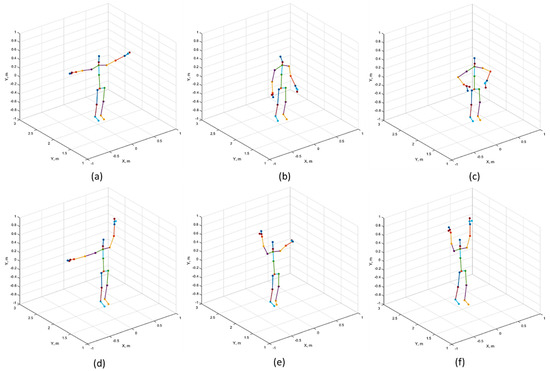 Postures: (a) hands outstretched; (b) hands down; (c) hands on the waist; (d) left hand up; (e) right hand up; and (f) both hands up.