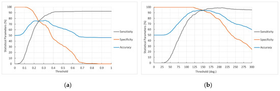 Relationship between specificity, sensitivity, accuracy and threshold for: (a) Algorithm 1; and (b) Algorithm 2.