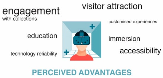 In order to better understand the use of VR in the targeted museums, an exploration of the perceived advantages gained from its use by museum professionals was also necessary. Overall, seven categories of advantages were identified based on the participants’ replies, relating to engagement with collections, visitor attraction, accessibility, education, immersion, customized experiences, and technology reliability (see Figure 1).