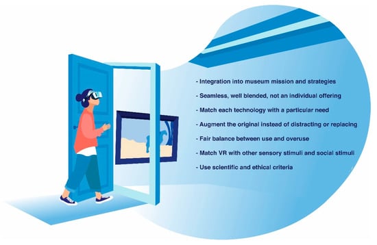 The previous sections outlined the current uses of VR applications in museums, which departments are responsible for new technologies and digital strategies, and highlighted the perceived advantages and challenges of VR technologies. All the aforementioned needs and perceptions should be taken into account and guide the design of VR in museums. The perceptions and experiences of the participating professionals, some of which are also confirmed by the available literature, lead us to particular suggestions (see Figure 3) that could be considered when designing and incorporating VR applications in museums.