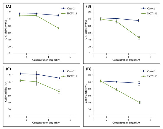 Cell viability assay on Caco-2 (non-invasive) blue line and HCT-116 (invasive) green line after treatment with aqueous extracts obtained by hot water extraction (HWE; A,B) and rapid solid-liquid dynamic extraction (RSLDE; C,D) at different concentrations. The response was observed after (A,C) 24 and (B,D) 48 h exposure.