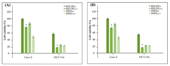 Comparison of proliferative activities on Caco-2 (non-invasive) and HCT-116 (invasive) cell lines of the dialyzed extracts from hot water extraction (HWEIN and HWEOUT) and rapid solid-liquid dynamic extraction (RSLDEIN and RSLDEOUT) after 24 (A) and 48 h(B) exposure (* p < 0.05).
