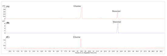 GC-MS chromatograms of acetylated methyl glycosides from RSLDEOUT (A); acetylated mannitol (B); acetylated methyl glycoside of glucose (C).