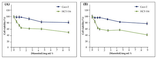 Caco-2 and HCT-116 cytotoxicity under different mannitol concentrations (0, 1.0, 1.2, 2.43, 4.5, 9.0 mg mL−1). MTT (3-(4,5-dimethylthiazol-2-yl)-2,5-diphenyltetrazolium) cell viability after 24 (A) and 48 h (B) exposure.