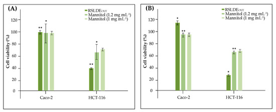 Comparison of proliferative activities on Caco-2 (non-proliferative) and HCT-116 (proliferative) cell lines of RSLDEOUT (containing 1.1 mg mL−1 of mannitol) and the mannitol concentrations at 1 and 1.2 mg mL−1 after 24 (A) and 48 h (B) exposure (* p < 0.05, ** p < 0.01).