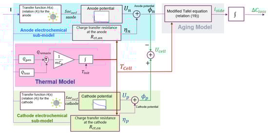 The electro-thermal aging model described in the previous paragraphs can be represented by the block diagram of Figure 1. In this figure, the sub-models denoted ‘Anode’ and ‘Cathode’ are deduced from the description performed in Section 2.1. The thermal model of Section 2.2 provides the cell temperature information from the current applied to the aging model described in Section 2.3. This model has been validated by several tests, as described in [6].