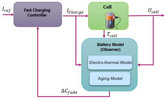 The fast charging strategy developed in this paper, which can be integrated in a battery management system (BMS), is described globally by Figure 2. In this diagram, the model presented in Section 2 is used in the battery observer to simulate the battery behavior under various operating conditions. Using measures of the cell current , voltage and temperature , this observer estimates (among other information) the cell capacity fade . This information is used by a fast charging controller that adapts the charge current magnitude to follow a charge profile while reducing the cell capacity fade during recharge.