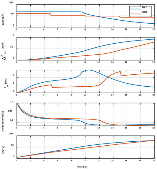 in which Qtrans denotes the Li-ion charges stored in (Ah), ΔCloss denotes the capacity loss (Ah), and tf (s) is the charging time. Sequential Quadratic Programming (SQP) is used to solve the optimal control problem defined by Relations (20) to (23) for various operating conditions.