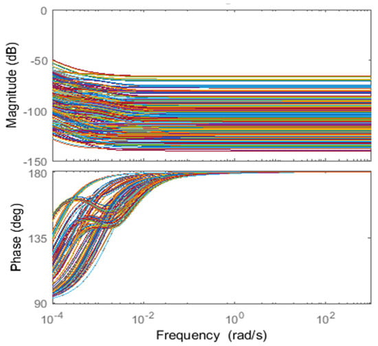 The frequency responses of the linear models obtained through the linearization of model (24) (see Section 4.2) for various operating conditions (temperature, aging, SOC) are shown on Figure 5. This figure highlights that, in low and high frequencies respectively, the gains of the linear models are of order 1 and 0. Thus, for a low-pass filter behaviour of the controller in high-frequencies and as an integrator in low-frequencies, the open-loop orders and are defined such that and . The minimization of the complementary sensitivity function resonance peak variation according to Relation (32) is acheived under the design specifications that follows: