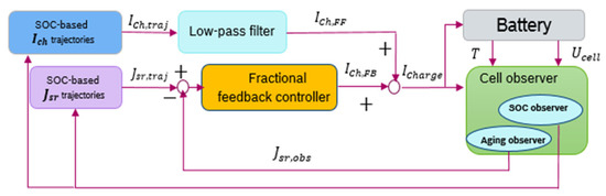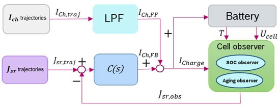 As shown in Figure 6, a low pass filter was implemented for the reference current profile smoothing. With the control scheme of Figure 6, if the battery behaviour fits the one used for the charging profile optimisation, the charging current ICharge that makes it possible to track the optimal Jsr,traj is equal to the feedforward current ICh,FF. The feedback controller thus has no effect. Conversely, if the battery behaviour differs from the behaviour of the model used for the optimisation of the charging profiles, the feedback loop adapts the charging current. It imposes the computed optimal side reaction current on the cell. As only cell temperature T, charging current ICharge and voltage Ucell, are measureable signals, an aging observer using the cell model was designed to estimate the side reaction current.