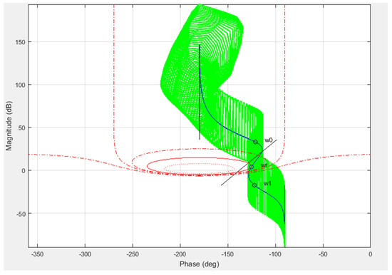Using the Nichols plot, by minimizing criterion J in Relation (32), the optimal parameters move the frequency uncertainty domains so that they cover areas of low stability margin as little as possible around the (−180, 0 dB) critical point on the Nichols chart (as the open-loop frequency response uncertainty domains are those of the plant). Only a nonlinear optimization method can be used to compute the optimal parameters as uncertainties are not norm-bounded and taken into account by the least conservative method. If N+ = N− = 0 in Relation (29), only the independent four parameters ω0, ω1, ωr and Yr=|β(jωr)|dB need to be optimized in Relation (27). In the Nichols chart, the tangency of the frequency response βnom(jω) to the desired MTnom circle can be ensured by computing the other parameters of Relation (27), such as a0 and b0. The optimal open loop transfer function being found, the controller C(s) can be obtained with the ratio of the optimal open-loop frequency responses by the nominal plant defined by