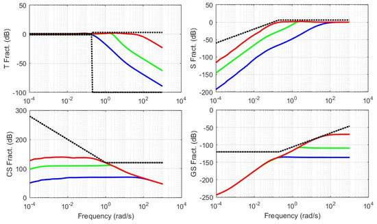 Gain diagram of the four sensitivity functions (solid line, green for the nominal behaviour, red and blue for two extreme behaviours of the plant) and user defined constraints (dotted lines).