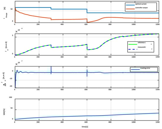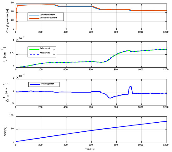 Variations in some parameters of the battery model, such as electrolyte resistance, initial temperature and initial SEI layer, were carried out to evaluate the robustness of the modified charging strategy. The simulations performed with a cell at its BOL, and for an ambient temperature of 10 °C, are shown in Figure 11. This figure proposes a comparison between the current produced by the controller and the optimal charging current defined by the trajectory planning strategy. It highlights that the controller output moves away from the optimal current profile to maintain the optimal side reaction current tracking represented on the second diagram of Figure 10. As shown by the third diagram of Figure 11, this leads to a negligible tracking error. Using the control scheme of Figure 10, Figure 11 shows that, within the desired charging time of 20 min, the target SOC of 80% is reached.