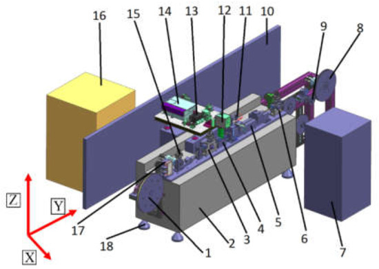 The raster generation bench consists of a massive fine-structured granite base and the tape movement devices mounted thereon presented in Figure 1, the laser raster generation components and the raster scale error management system components. Figure 1 illustrates the raster generation bench: 1—tape unwinding mechanism, 2—granite base, 3—tape displacement using angle measuring system, 4—deflection node, 5—error monitoring unit, 6—pulling—stretching system, 7—control panel, 8—tape winding mechanism, 9—mechanism for covering tape in a protective band, 10—indoor partition, 11—microscopes with CCD camera, 12—scanner, 13—optical laser beam deflection system, 14—laser, 15—constant belt tension mechanism, 16—device computing control set and laser and scanner freezer, 17—tape stretch control and management system, 18—vibration isolation supports. The length of the granite base is 2 m in the Y direction.
