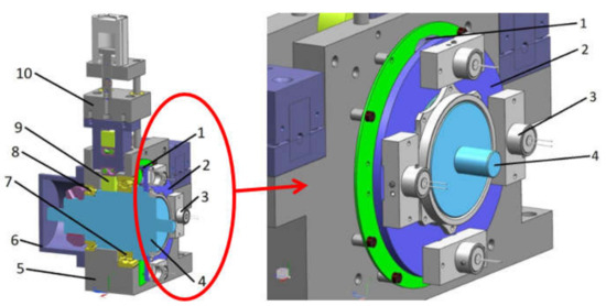 One of the most important components of the device is the tape displacement measuring system (Position 3 in Figure 1). Figure 2 presents its 3D images in cross-sections: 1—angle transducer base, 2—angle transducer limbo, 3—optical angle transducer heads, 4—precision tape displacement measurement shaft, 5—system base, 6—hood, 7,8—rotary system bearings, 9—tape clamping shaft, 10—tape clamping mechanism. The circumference of the steel band tape measured in the precision tape displacement measurement shaft is 200 mm. Accordingly, the diameter of this shaft at the point of contact with the tape is 63.662 mm.