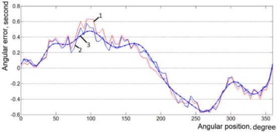 Figure 3 presents a graphical illustration of a parametric function of its two realizations of the tape displacement using the angle measuring system error and approximation of its means. 6 measurements were made, and 6 realizations were obtained; Figure 3 presents error graphs of 2 realizations and an approximation of the means of the 6 realizations.