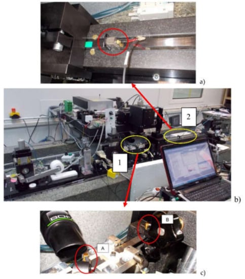 Adverse deviations in the position or the shape of symbols being generated that way depend on uncontrolled deviations of parameters of the said movement of the tape and the light beam from the set parameter values []. Tape vibrations forming as a result of the system tape movement mechanism and other internal and external sources of excitation of vibrations are one of the most important components of such deviations [,,] They affect the occurring uncontrollable changes in tape’s position, the displacement velocity and tape deformations that have an adverse impact on the quality of the structures being generated, also affecting the accuracy and reliability of active process control done in real time []. This impact on the system of defined parameters depends on vibration parameters—frequencies, amplitudes and other statistical characteristics. Knowing these parameters is important for developing the structure and optimizing the processes of formation of the structure and the symbols [,,,].