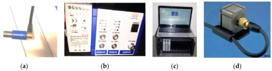 Instruments for measuring and analyzing vibration and displacement parameters: capacitive displacement sensor CS02 (a) with controller DT6220, demodulator DL6220 ad power source (b); triaxial accelerometer 4506 (c); portable metering result processing, storage and control equipment 3660-D with DELL computer (d).