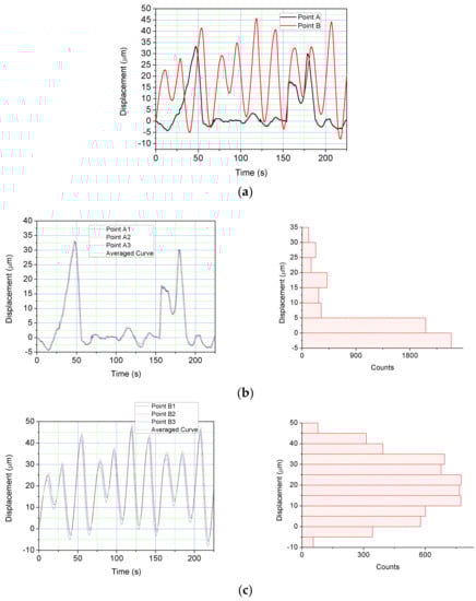 The received measurement results are presented in Figure 7, Figure 8 and Figure 9. Figure 7 illustrates results of vertical displacements of the two points (A and B) (also see Figure 4c) of the tape. Figure 7a presents displacement results of points A and B (also see Figure 4c) in operation (a generated raster distance of 500 mm), and Figure 7b,c illustrates the curve and mean of three realizations, additionally presenting histograms of the mean. Table 1 presents statistical parameters of three realizations of the displacement (A1, A2 and A3 and B1, B2 and B3) of points A and B (also see Figure 4c).