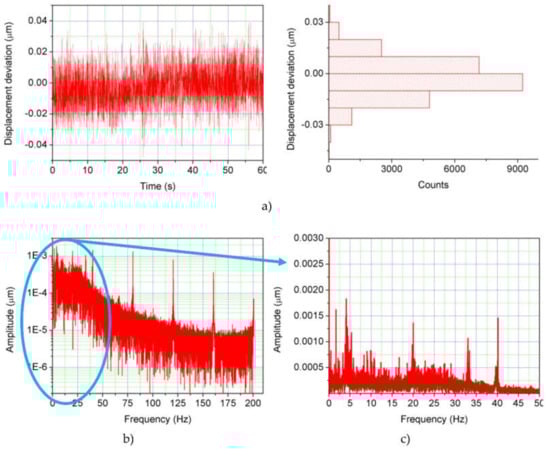 Figure 8 presents the results of the measurement of the displacement of the tape–angle transducer contact point, which is calculated using the results of the angle sensor. Figure 8a illustrates the time graph and the histogram, Figure 8b presents the spectral density graph and Figure 8c—the spectral graph part expanded to 50 Hz.
