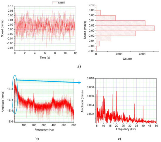 Results of the measurement of the steel tape velocity (also see Figure 4a): (a) time graph and histogram, (b) spectral density graph, (c) spectral graph part expanded to 50 Hz.