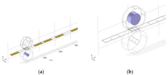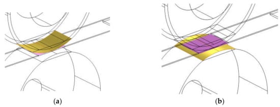 The contact pairs defined boundaries for parts that could come into contact as shown in Figure 11a,b, for upside and downside contacts, respectively. The augmented Lagrangian was selected as the algorithm for computing contact in the normal direction. Characteristic stiffness in current simulation was equivalent to Young’s modulus. Penalty factor controls the stability and stiffness of the interface surface during iterations. Moreover, an additional control over solver cutbacks, such as trigger cutback criterion in numerical simulation, was not used because there was no destination boundary movement history. The exponential dynamic Coulomb friction model using both static and dynamic friction coefficients were included in the time dependent study for both contact pairs (Figure 11).