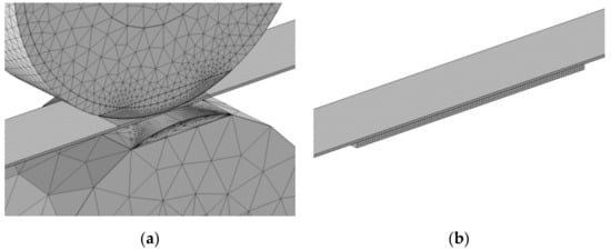 Figure 14 below presents a compiled mesh of finite elements. The steel tape unit was modeled using COMSOL Multiphysics software. The quality of mesh elements maximizes in the contact zone. In the simulation, 0.48 and 0.93, respectively, were the minimum and the average element qualities.