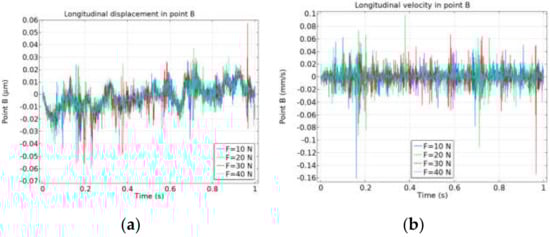 (a) Longitudinal displacement and (b) longitudinal velocity in point B, under variable preloads from 10 to 40 N.