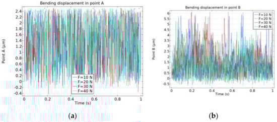 Bending displacement in point A (a) and B (b) under different top roller preloads.