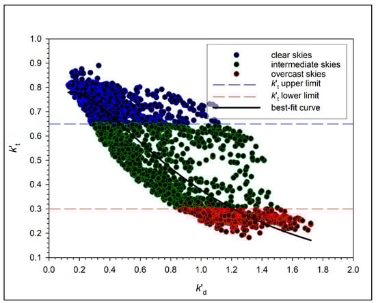 Graph of hourly k’t vs. hourly k’d values over one complete year for the site of Alexandroupoli; the limits of overcast, intermediate and clear skies are shown. The solid black line is the best-fit curve to the data points from Equation (20) with R2 = 0.82.