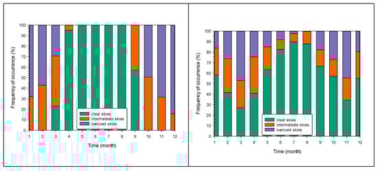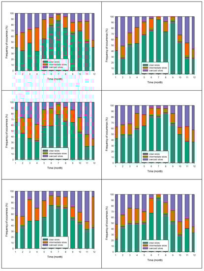 Figure 2 provides information about the distribution of clear, intermediate and overcast skies over eight sites in Greece following the k’t limitations. The other sites in Table 2 show similar patterns (not shown here).