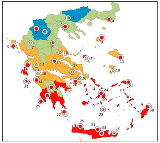 Map of Greece showing the location of the 33 Hellenic National Meteorological Service (HNMS) stations (white circles) across the 4 climatic zones: A (red), B (orange), C (green), and D (blue) according to TOTEE (Technical Guide of the Technical Chamber of Greece) [62]. The numbers in the map correspond to those in the first column of Table 2. The red dots correspond to locations in which IWYEC2s (International Weather Years for Energy Calculations) have been derived by ASHRAE (American Society of Heating, Refrigerating and Air-Conditioning Engineers) [65] in the period 1982–1999; they are shown for comparison.