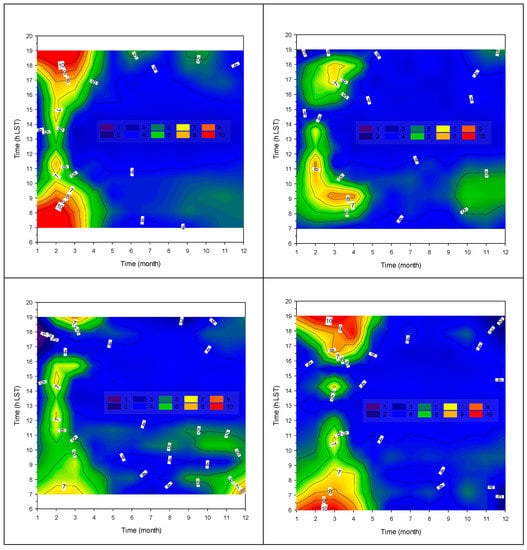 Figure 4 shows the month–hour graphs of TL under all-sky conditions for the selected sites. A general observation is the relatively high values of TL during almost all day in January, February, March or even early April. Lower values are observed at midday. The morning and evening peaks (8 a.m. and 5–6 p.m.) may correspond to rush hours as the meteorological data used to calculate TL comes from HNMS stations mostly situated at airports and/or close to towns. Similar observations to ours have been reported over individual years in Rome and Arcavacata di Rende, Italy [13], various locations in Zimbabwe [16], and over Sfax in Tunisia [18]. In late spring, autumn and winter, TL decreases in the evening because of its sensitivity to low solar elevation angles (higher air masses).